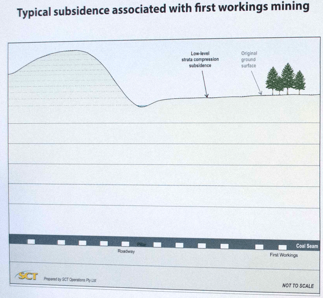 Importantly for us, Wollongong Coal completely glossed over the issue of subsidence. Subsidence is the vertical shifting of earth which can cause cracks to appear in the surface, water loss and contamination. Although subsidence is much more prominent with longwall mining, is still occurs with bord-and-pillar mining. A simplistic diagram drawn up by geotechnical consultancy firm Strata Control Technology (SCT) seeks to show that the “typical” subsidence for first workings bord-and-pillar extraction is virtually none.