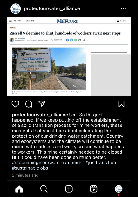 Image 6th Feb 20242nd Apr 2024 Protect Our Water Alliance Russell Vale Colliery to close, too unsafe (and too bad for lots of other reasons too) Share this: Click to share on X (Opens in new window) X Click to share on Facebook (Opens in new window) Facebook Related